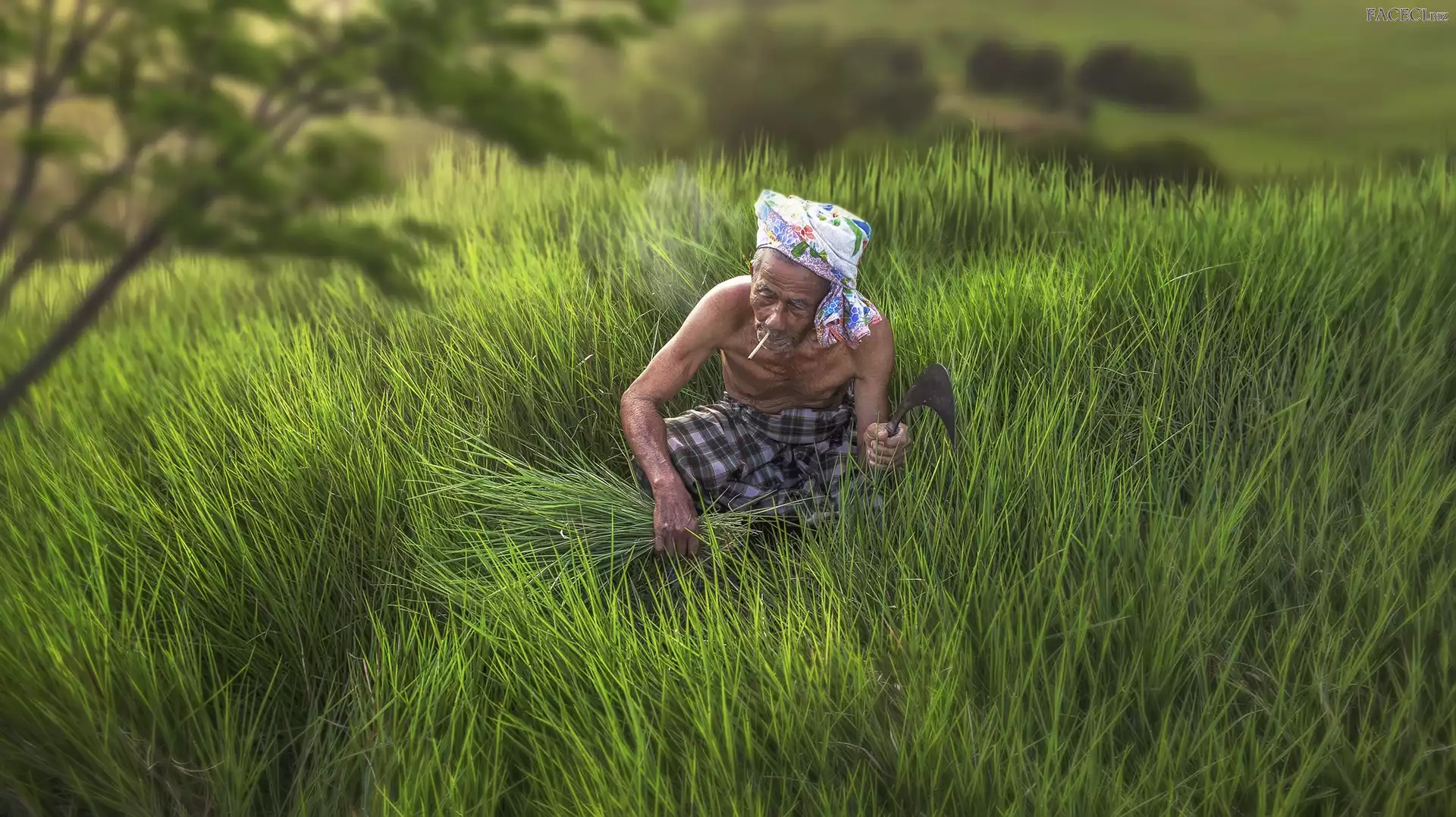 Rozmycie, Papieros, Starszy, Trawa, Drzewa, Mężczyzna, Chustka - faceci.biz